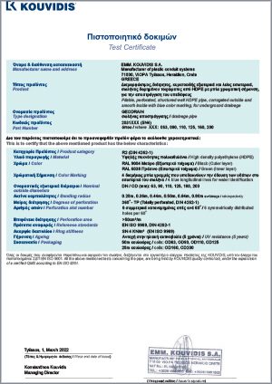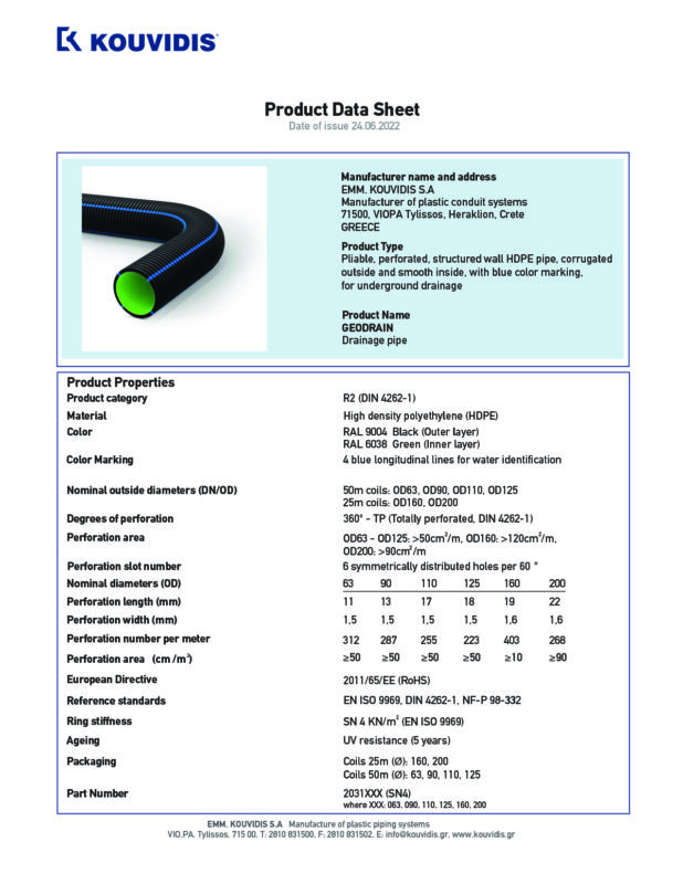 Твърдата перфорирана тръба GEODRAIN се произвежда на кангали по 50m и 25m и твърдост на пръстените SN4. Има две стени, гофрирана външна и гладка вътрешна стена, които са с обща конструкция и е симетрично перфорирана на 3600. Външната й стена е гофрирана така, че да позволява по-лесен монтаж, следвайки морфологията на почвата, а вътрешната стена е гладка, за да улесни изтичането на водата. Много по-ниското й тегло улеснява товаренето и транспорта, като същевременно се реже лесно без инструменти. KOUVIDIS е единствената изцяло гръцка компания, разработила технология за перфориране на тръби с двойна структурирана стена.