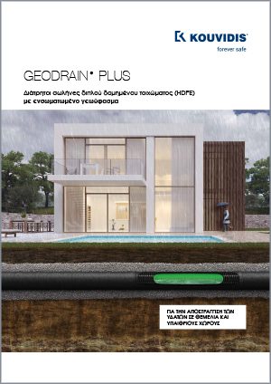GEODRAIN PLUS е ново поколение 4-слойна твърда тръба за отводняване, произвеждана на пръти от по 6m с твърдост на пръстените SN4 и SN8. Има две стени с обща конструкция и е симетрично перфорирана на 2200. Първият слой се състои от гладка вътрешна повърхност, която способства за гладкото изтичане на водата, а вторият слой се състои от гофрирана външна повърхност, която осигурява гъвкавост и механична якост. Третият слой се състои от 4 надлъжни сини ивици като цветово обозначаване за вода. GEODRAIN PLUS се предлага с предварително поставен иглено перфориран нетъкан геотекстил (150gr/m²), който съставя 4-тия слой.