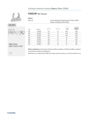Скобата CONDUR е проектирана за поставяне към гъвкави и твърди тръби KOUVIDIS. То е част от системите от тръби CONDUR – CONFLEX, MEDISOL – MEDIFLEX, SILCOR – SIFLEX, CONDUR HF – CONFLEX HF и MEDISOL PLUS – MEDIFLEX PLUS за разполагане и защита на кабели.