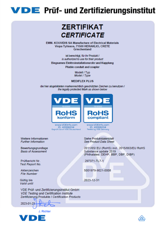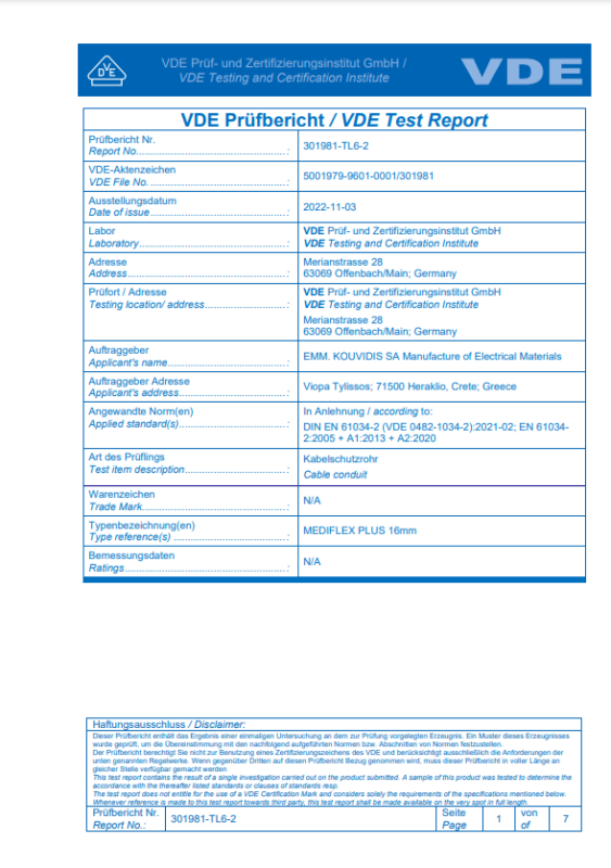 Тръбата се произвежда от специално стабилизиран термопластичен полипропилен, без съдържание на халогени (EN 50642), без съдържание на тежки метали (RoHS) и слабо отделяне на дим (EN 61034-2). Това я прави най-надеждното и безопасно решение в случай на пожар, като също така отговаря на изискванията на Регламент 364/2016/ЕС за противопожарната защита.